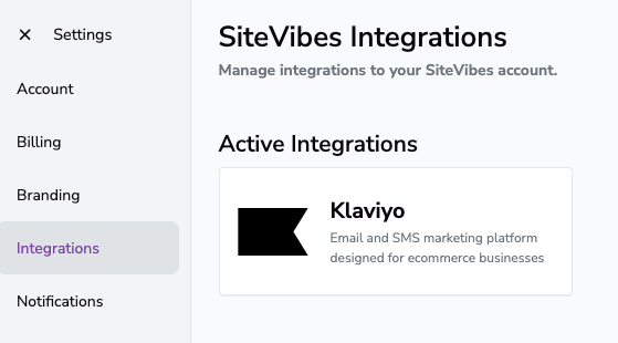 Go to app.sitevibes.com > Navigate to Settings > Inegrations > Klaviyo
